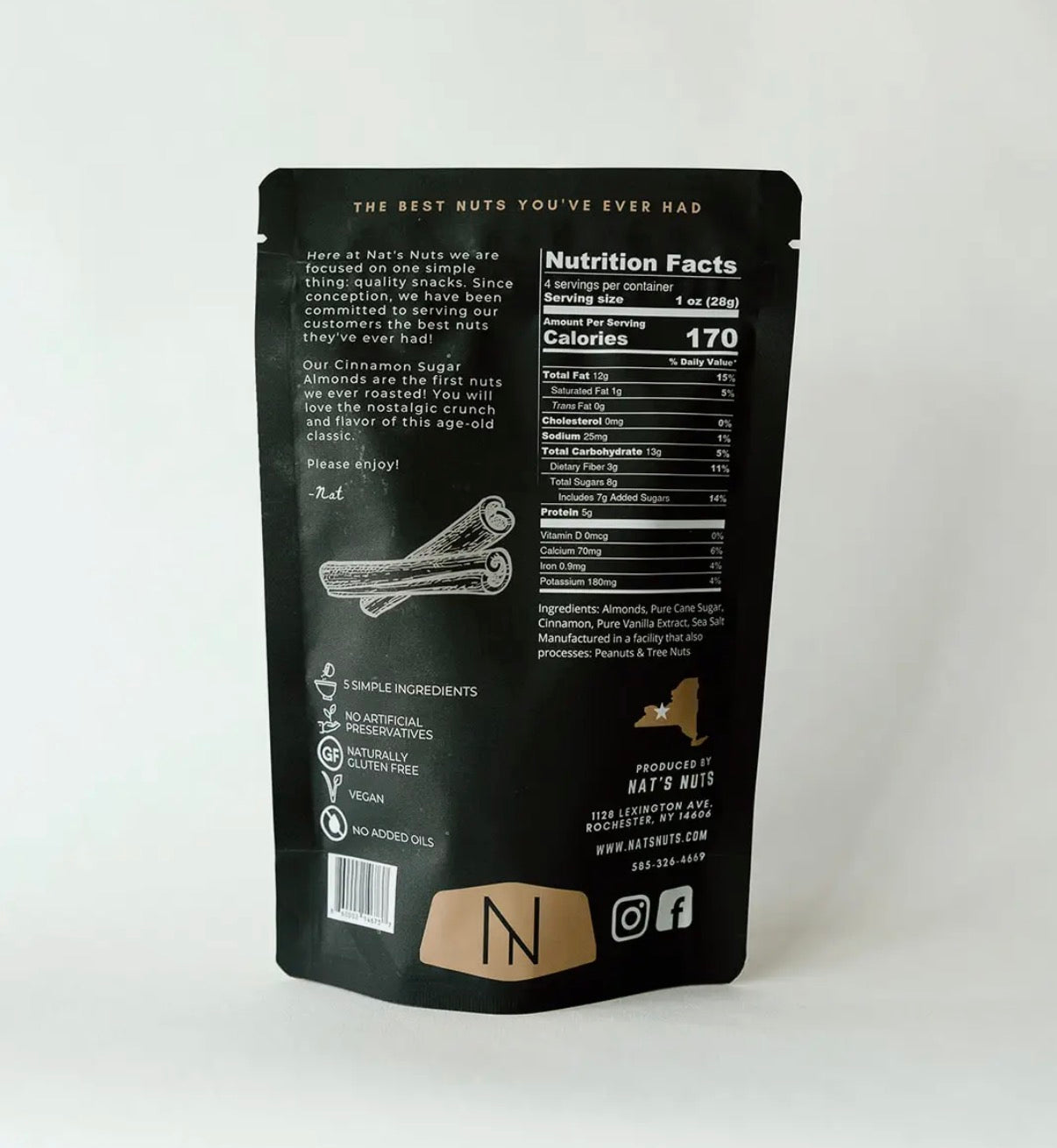 Our Cinnamon Sugar Almonds are the quintessential roasted nut. They have the nostalgic flavor of roasted nuts that you would get from a country fair or farmers market. Perfectly crunchy, nicely spiced and not too sweet, this product is made using the highest quality ingredients. Our Natural Ingredients: Almonds, Pure Cane Sugar, Cinnamon, Pure Vanilla Extract, Sea Salt Nat's Nuts are great in a gift basket or as a stand alone snack!